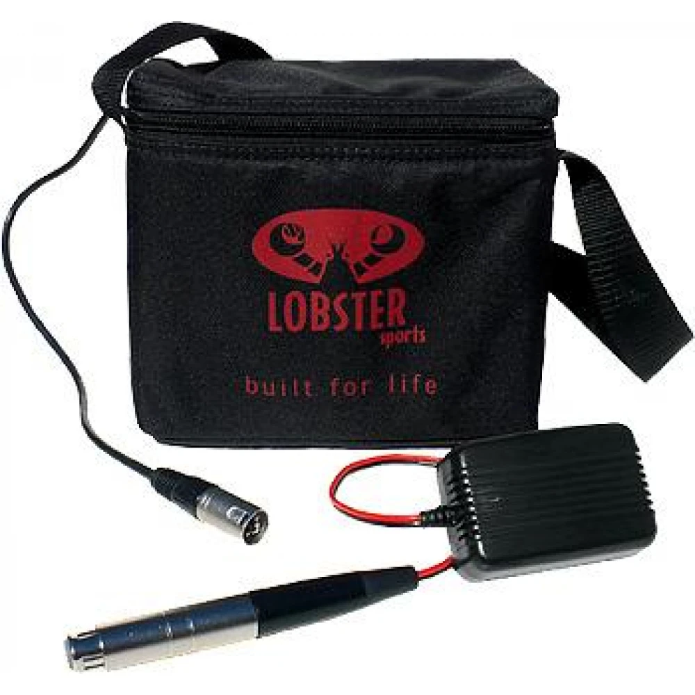 This Lobster elite battery pack includes a large 18-amp sealed lead-acid battery, battery cord with connector, XLR adapter, standard battery charger, and canvas carrying bag with shoulder strap.